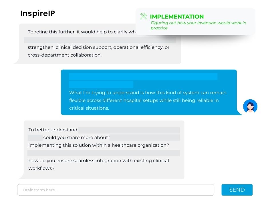 Work through how your idea could be implemented, from components to interactions, helping you describe your invention clearly and credibly.